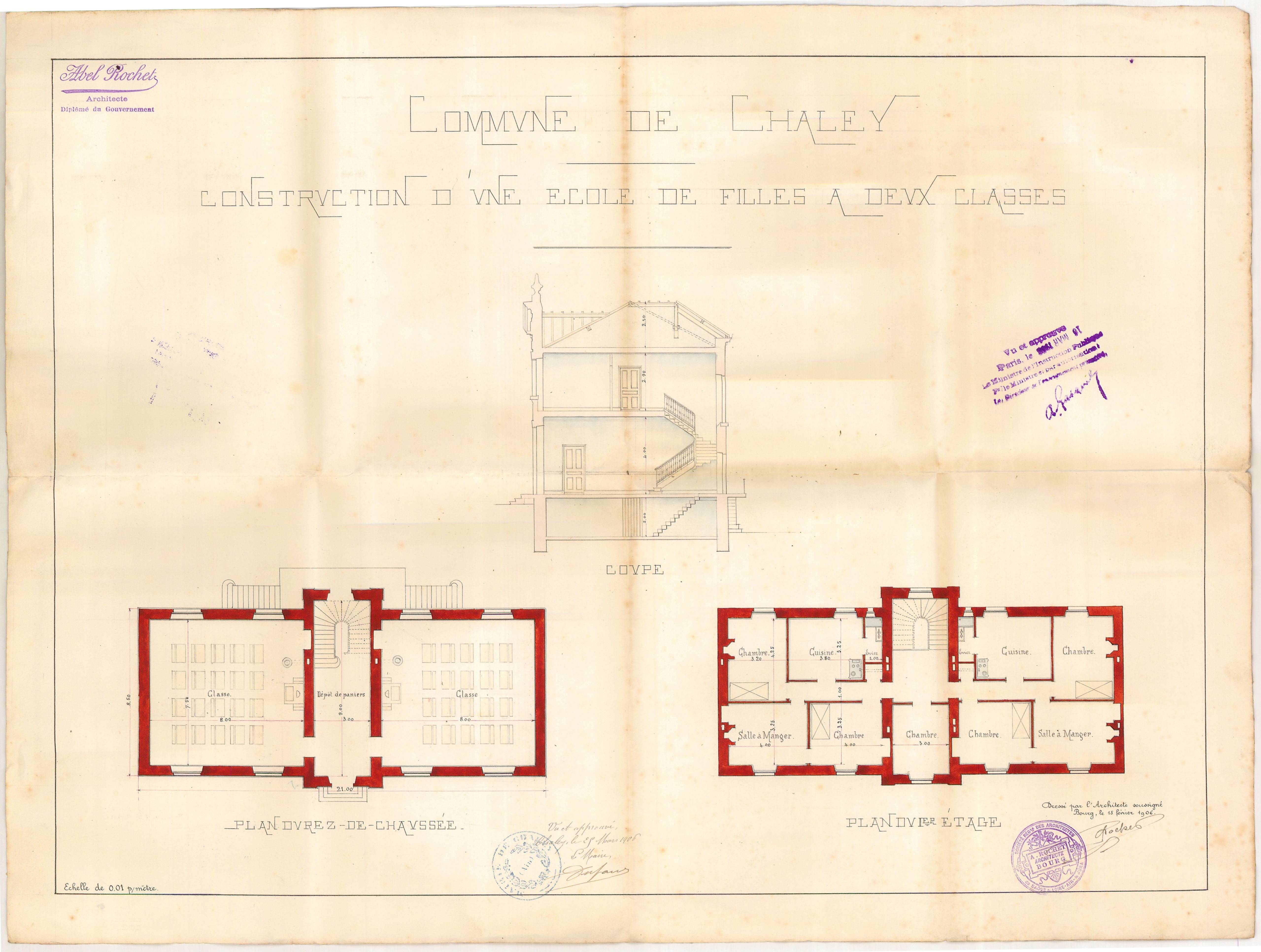Construction de deux classes et d’un mur de clôture : plan du rez-de-chaussée, du 1e étage, plan en coupe.