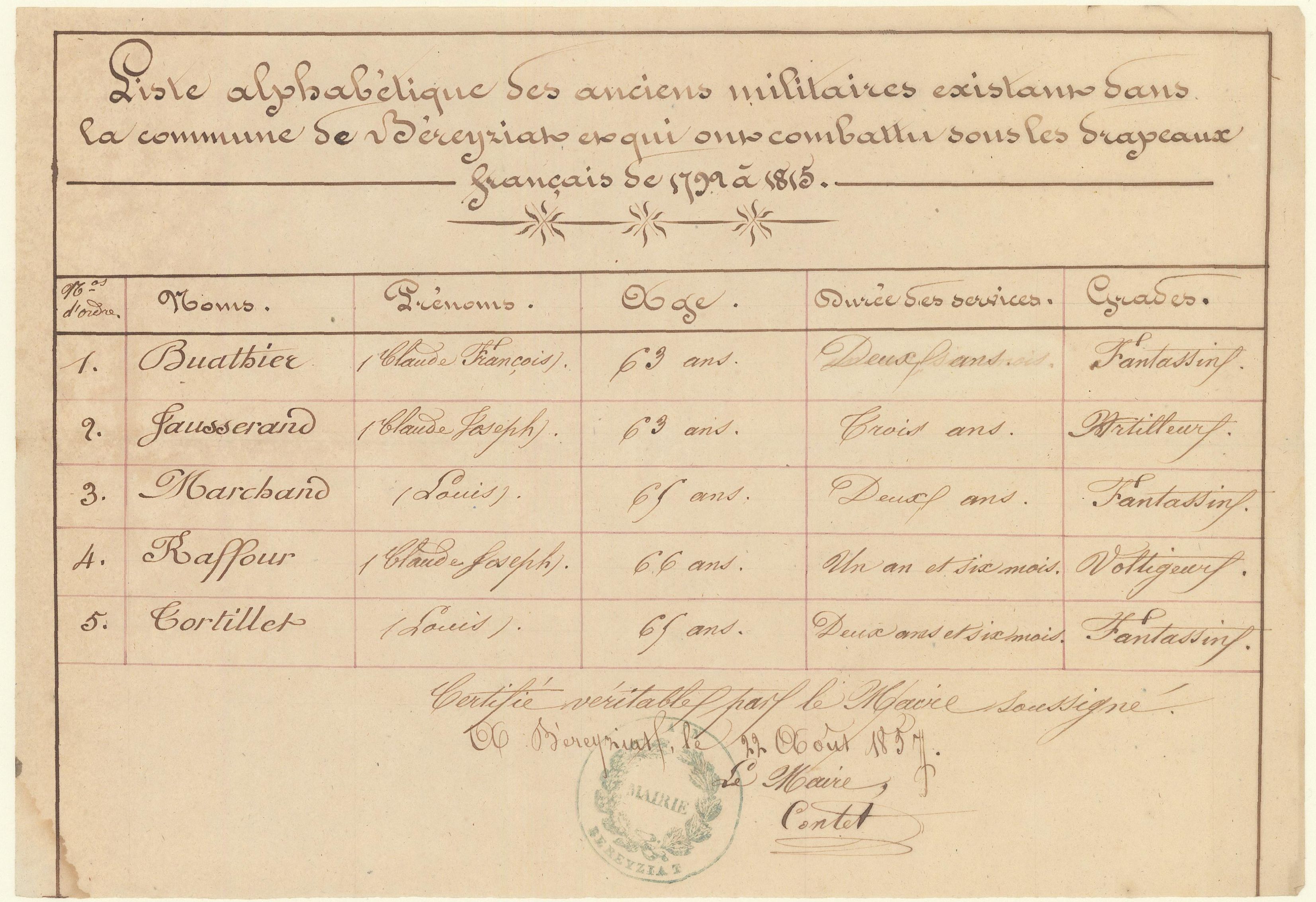 État nominatif des anciens militaires ayant combattus sous les drapeaux de 1792 à 1815, vue 01.