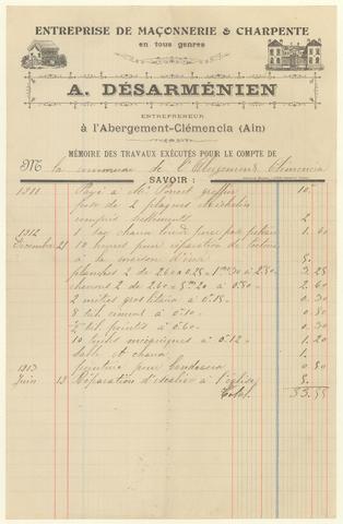 Facture de A. Désarmémien, entreprise de maçonnerie et charpente pour des travaux aux bâtiments communaux, vue 01.