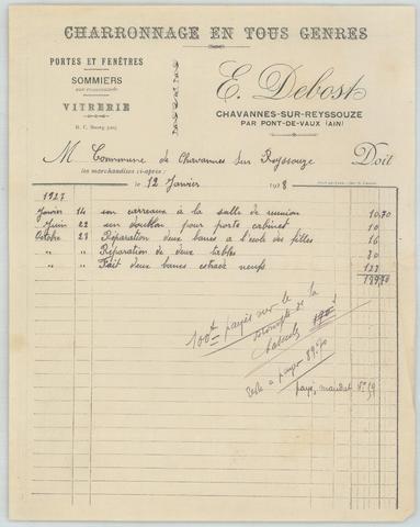 Facture d’E. Debost, entrepreneur de charronnage à Chavannes-sur-Reyssouze, vue 01.