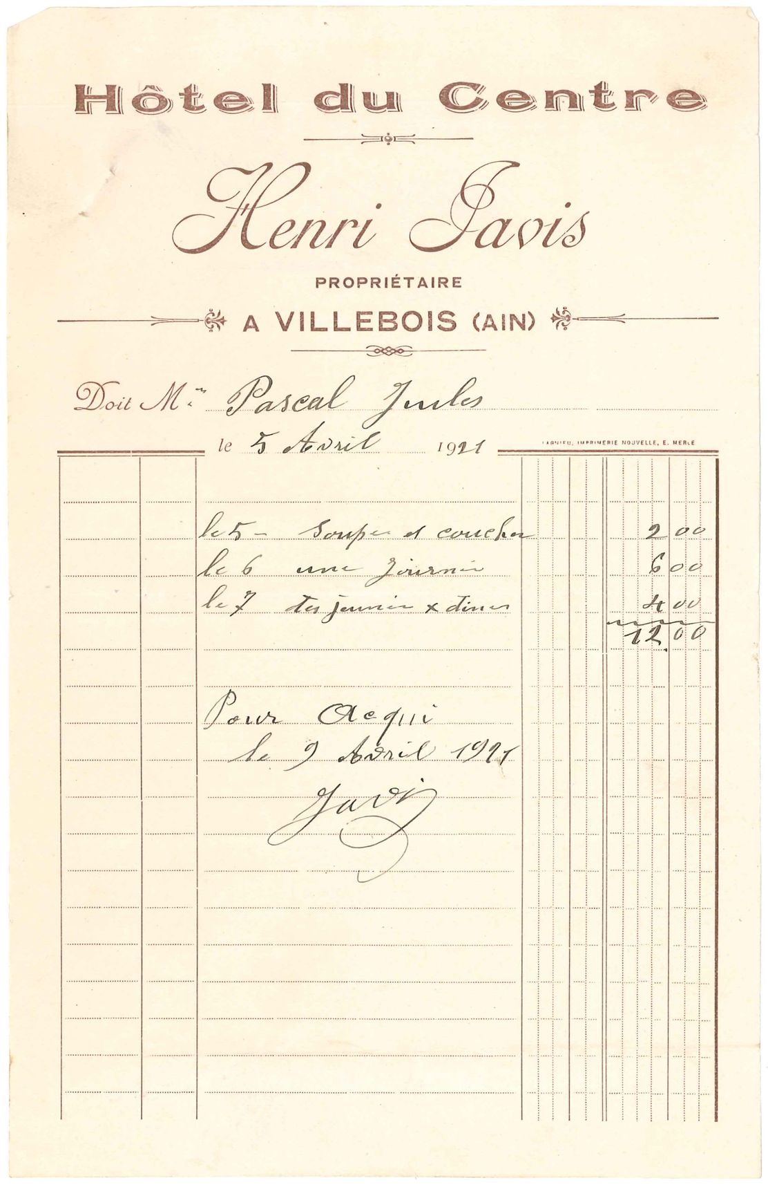 Facture de l’Hôtel du Centre Henri Javis à Villebois.