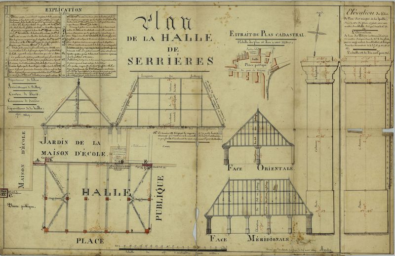 Serrières-de-Briord 1M3 - Halle de Serrières, réparations: plan de masse et levée, détail piliers (1849).