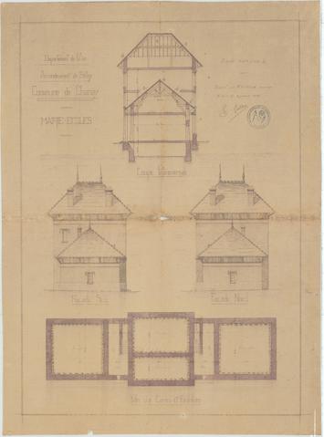 Plan des façades et coupes pour la construction de la mairie-école, vue 01.