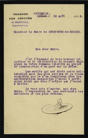 Serrières-de-Briord 1O4 - Pont métallique sur le Rhône, projet: lettre du député Joseph Bernier, 30 août 1922.