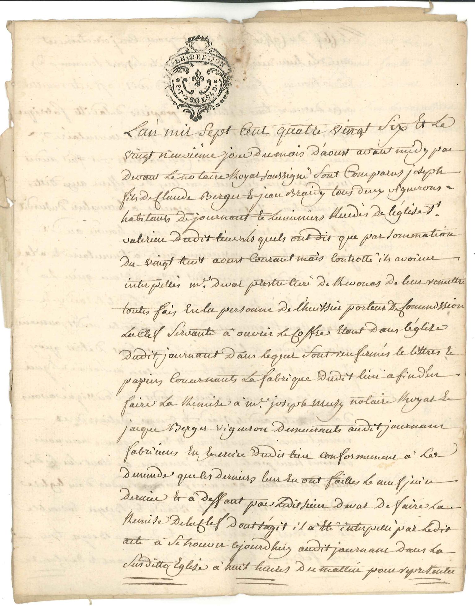Inventaire et remise des titres et papiers conservés dans le coffre de l’église de Saint Valérien et concernant la fabrique d’église par Joseph Berger et Jean Braidy, vignerons et luminiers de l’église à Joseph Musy et Jacques Berger, vue 01.