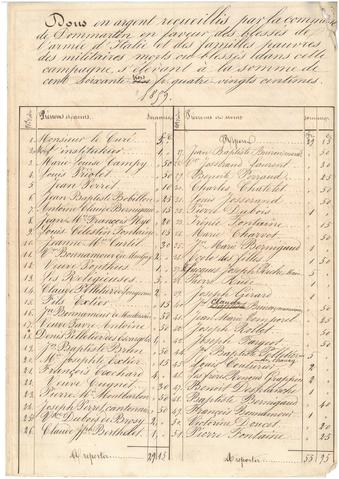 Liste nominative de souscription pour les blessés et familles de militaires tués à l’armée d’Italie, vue 01.