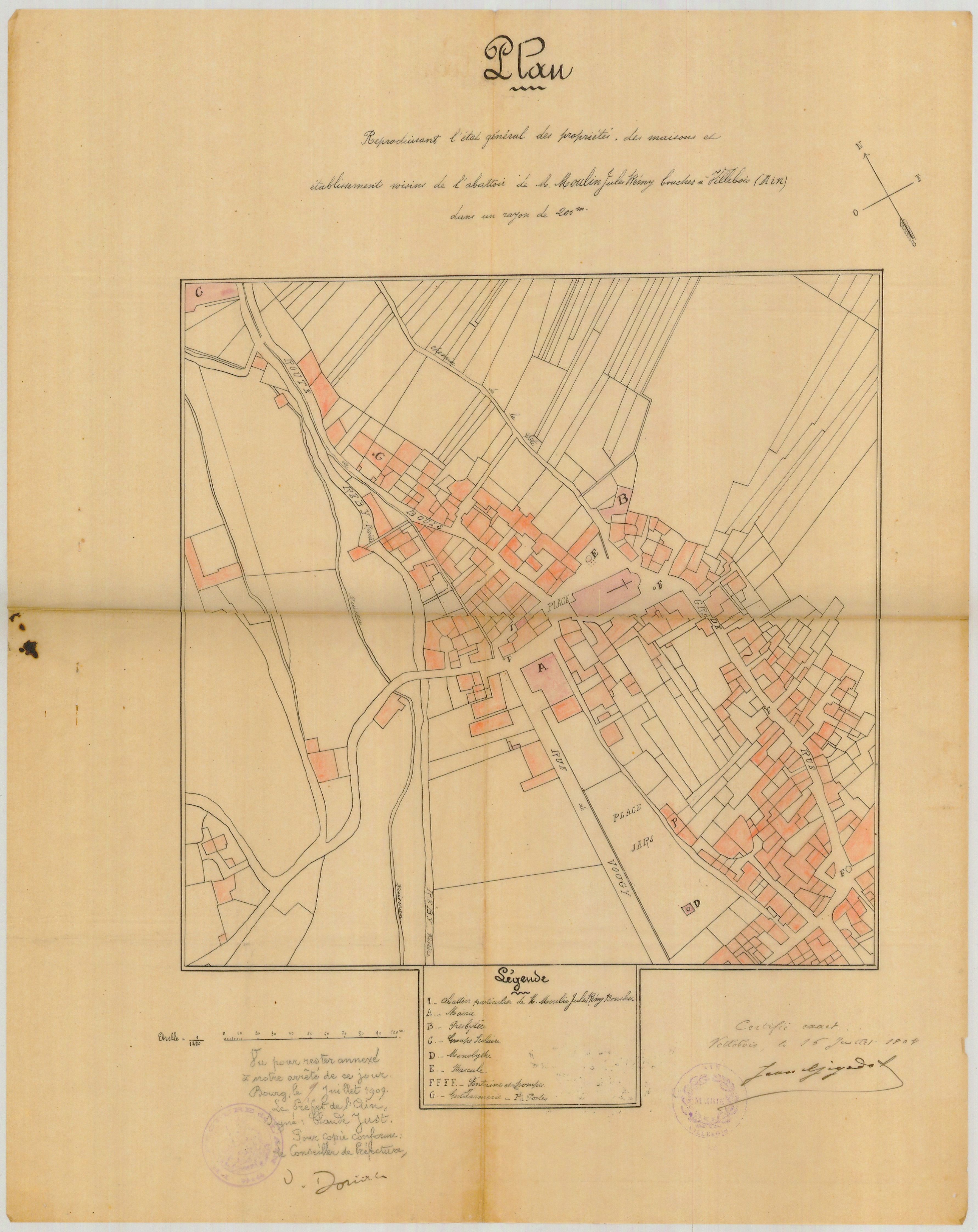 Plan général des propriétés, des maisons et établissements voisins de l’abattoir de Jules Rémy Moulin, boucher à Villebois.