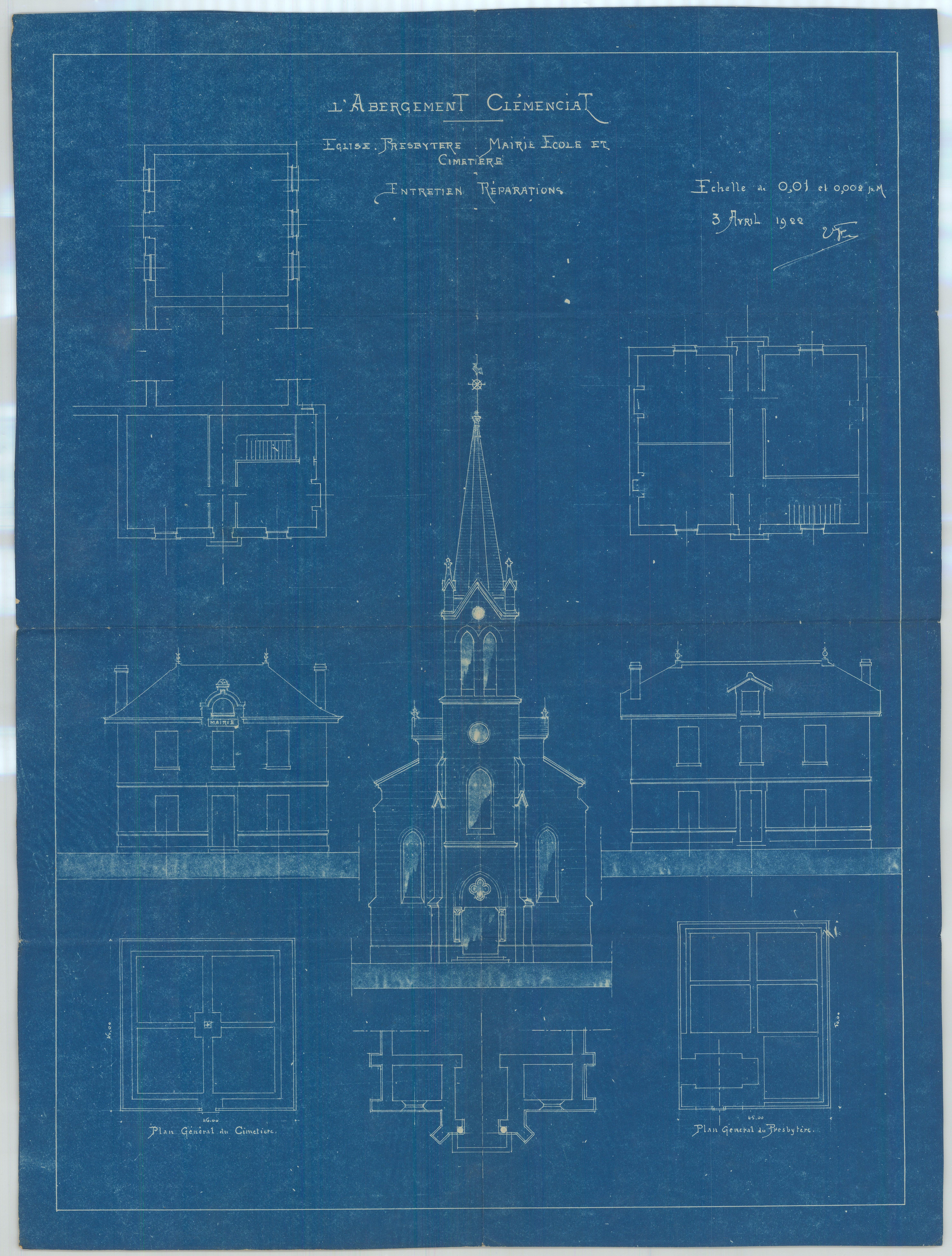 Plan pour des réparations consistant en la restauration du clocher, presbytère, cimetière et de la mairie-école, vue 01.