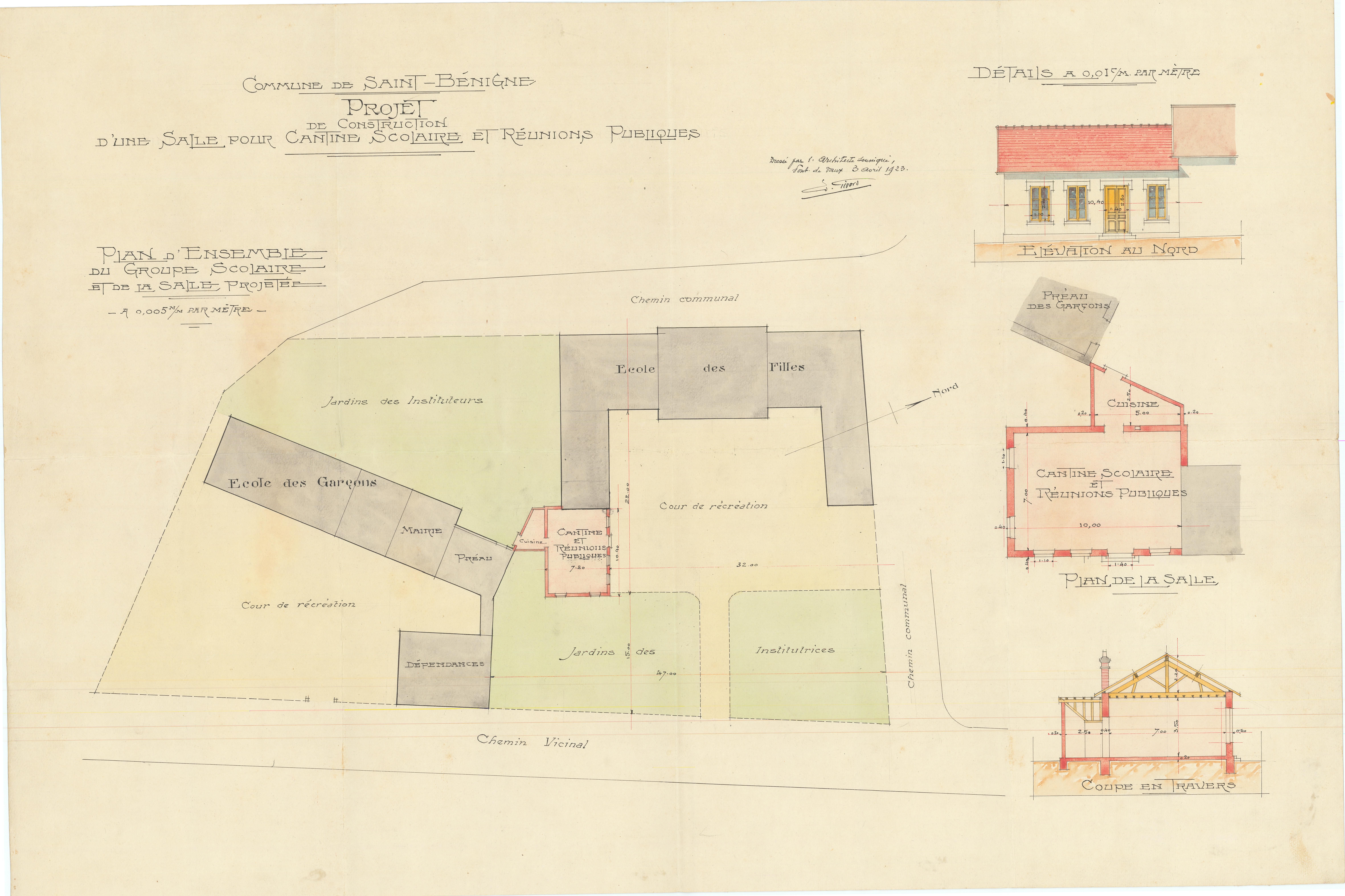 Plan pour la construction d’une salle pour la cantine scolaire et les réunions publiques, vue 01.